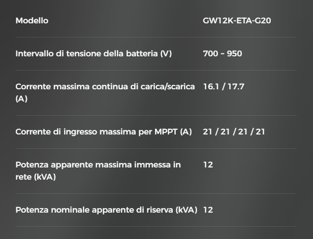Inverter trifase ibrido ALL IN ONE bidirezionale con battery manager 12kW, 4 MPPT, IP66, RS485, sezionatore DC, WiFi/Lan/Bluetooth per monitoraggio da remoto, energy meter monofase, cavi collegamento comunicazione con energy meter e batterie. Funzione immissione zero potenza in rete. Funzione di Back-up integrata. 10 anni di garanzia. CEI 0-21/CEI-018